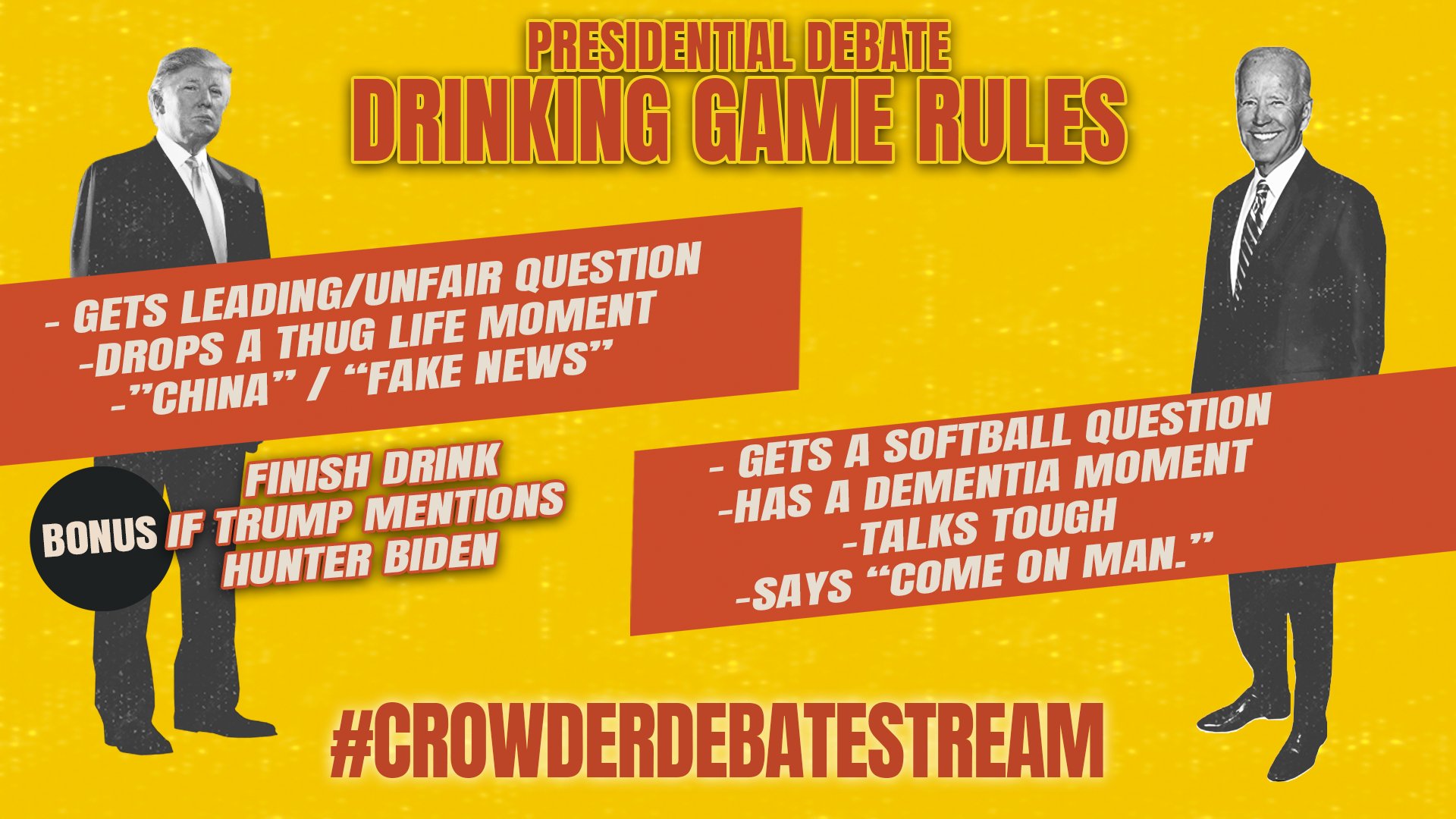 We ve got you covered. This fall of 2020 we get the pleasure of watching sleepy joe and the cheeto in chief battle it out on three different occasions. Take two drinks if it s from the party that s currently losing.