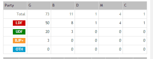 In kerala the local body elections are generally considered to be the semi finals to the state assembly elections. Chair person reservation standing committee in mun cor. The left democratic front ldf won more than half of all gram panchayats and municipalities and both they and the united democratic front udf won majorities in seven out of fourteen district panchayats each.